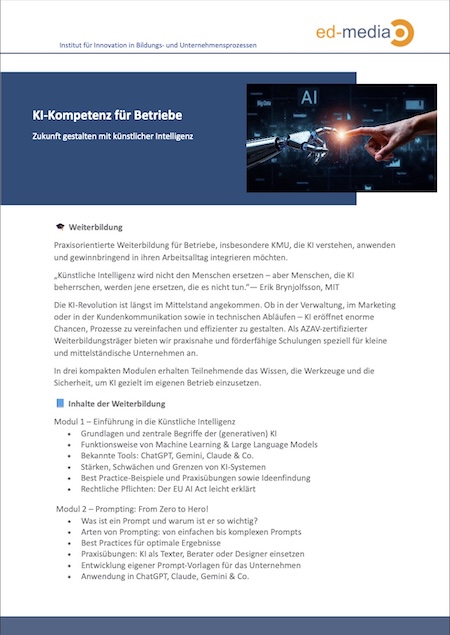 Die KI-Revolution ist längst im Mittelstand angekommen. Ob in der Verwaltung, im Marketing oder in der Kundenkommunikation sowie in technischen Abläufen - KI eröffnet enorme Chancen, Prozesse zu vereinfachen und effizienter zu gestalten. Als AZAV-zertifizierter Weiterbildungsträger bieten wir praxisnahe und förderfähige Schulungen speziell für kleine und mittelständische Unternehmen an.
